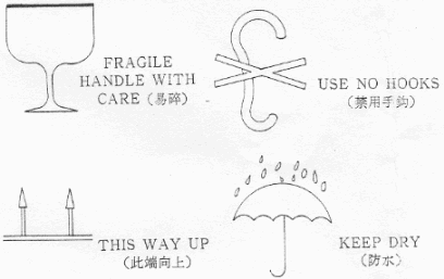 我國(guó)國(guó)家標(biāo)準(zhǔn)的貨物搬運(yùn)用警語(yǔ)圖案標(biāo)志,舉例如下: